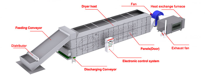 The chili drying machine utilize the hot air produced by the heat furnace as the drying medium.Through the hot air distribution unit, the hot air is transported to the mesh belt.
