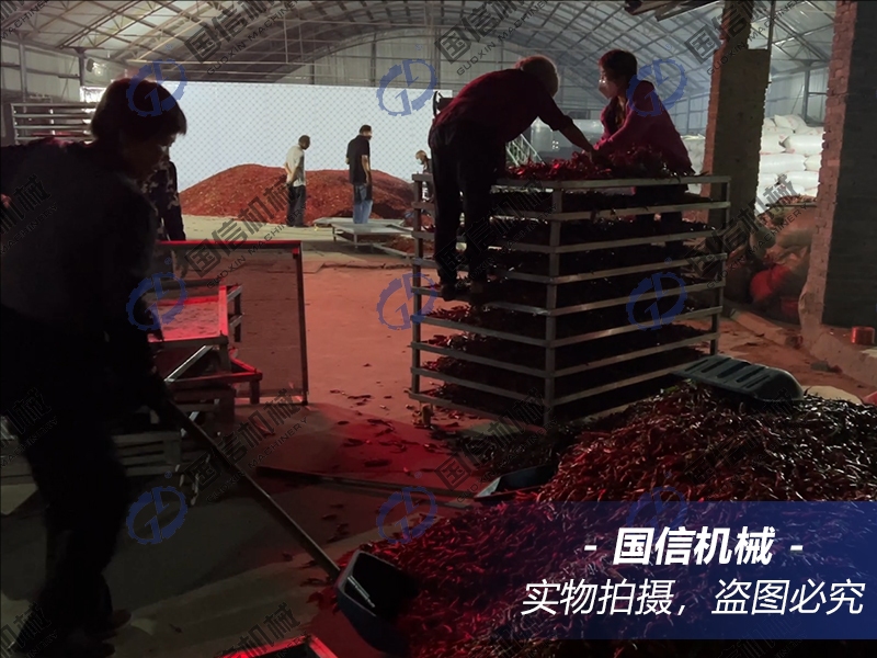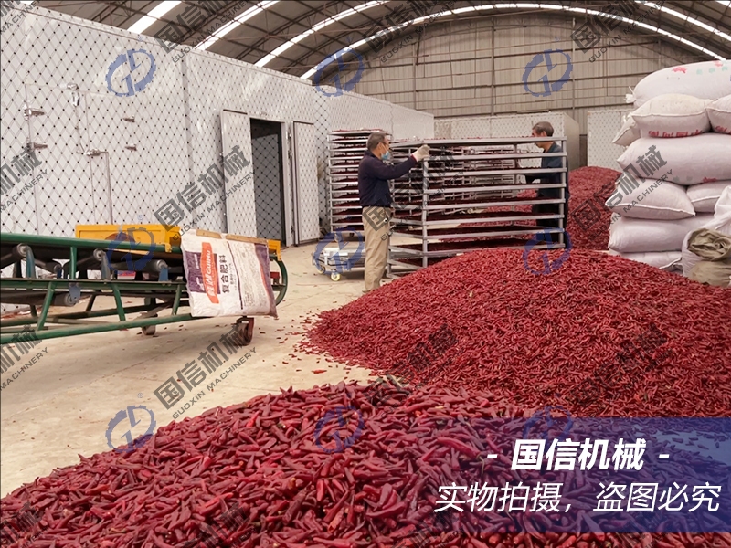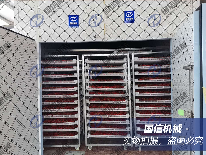 Guoxin chili dryer is a fixed box-type drying structure with a built-in trolley and drying tray. The chili peppers are placed on the tray for drying. It can dry hundreds to thousands of kilograms of chili peppers at a time, and can also be customized according to the actual needs of customers.