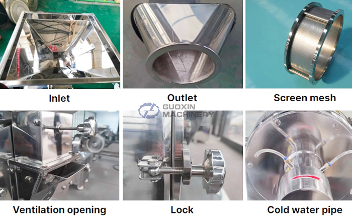 The machine is made up of a feeding material part, a crushing part, and a dust collection part.