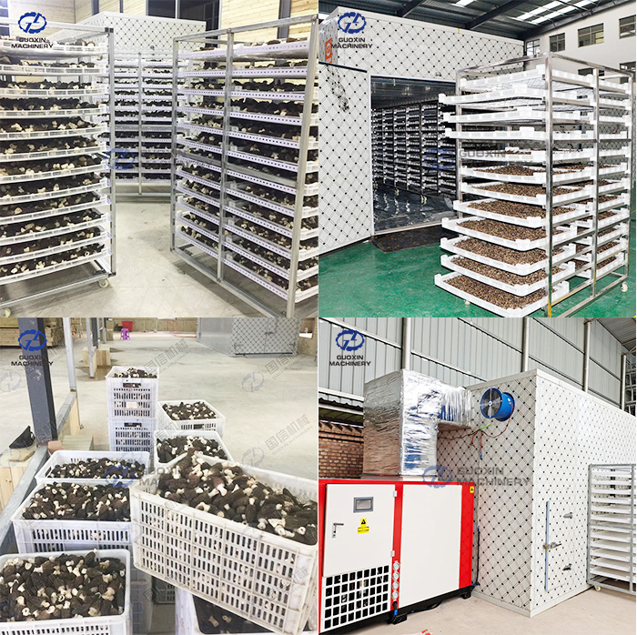Small mushroom dryers are about 15-20 cubic meters, and each batch dries 600-800 kilograms.