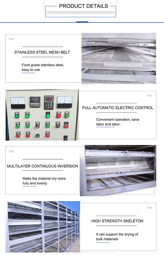 3.When wet materia lloaded in conveying belt, the relative position between every single material is quite stable. This is especially suitable for drying that product that needs good color,kind of mesh belt dryer is especially suitable for that product that should keep the good shape.